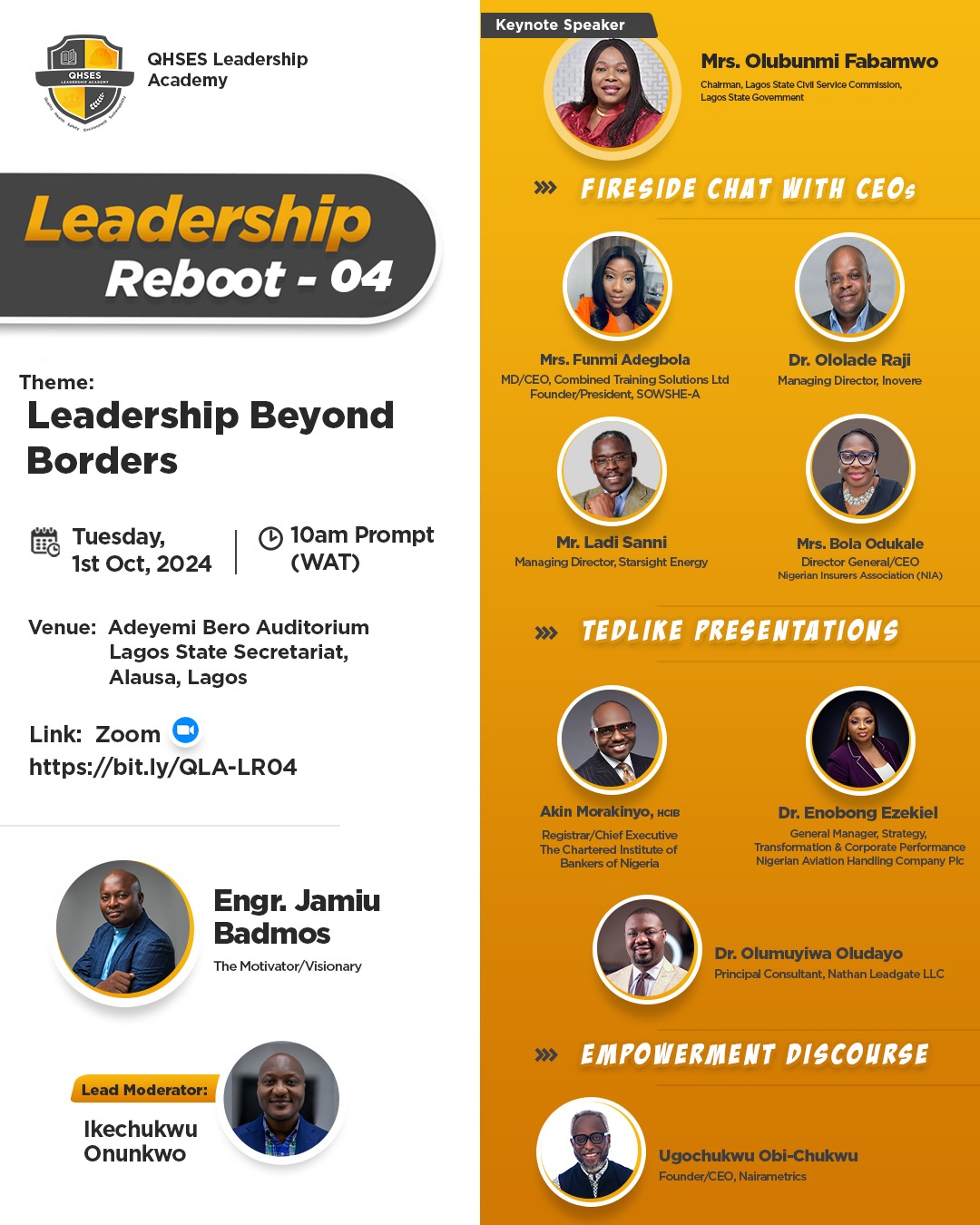 With an innovative vision, entrepreneurial spirit and a focus on humanity, The Leadership Reboot is an Annual Leadership Platform organized as one of the programs through QHSES Leadership Network, a Personal Social Responsibility (PSR) initiative of Engr. Jamiu Badmos designed to validate the words of Michelle Obama (former First Lady of the United States) that states “Success isn’t about how much money you make; it’s about the difference you make in people’s lives.”